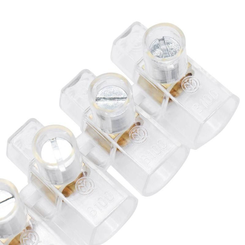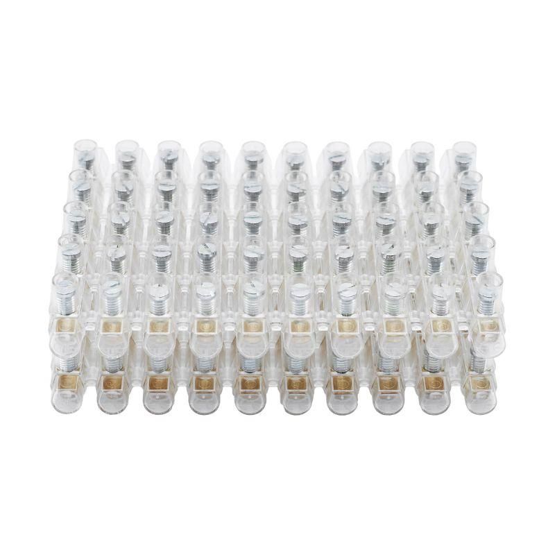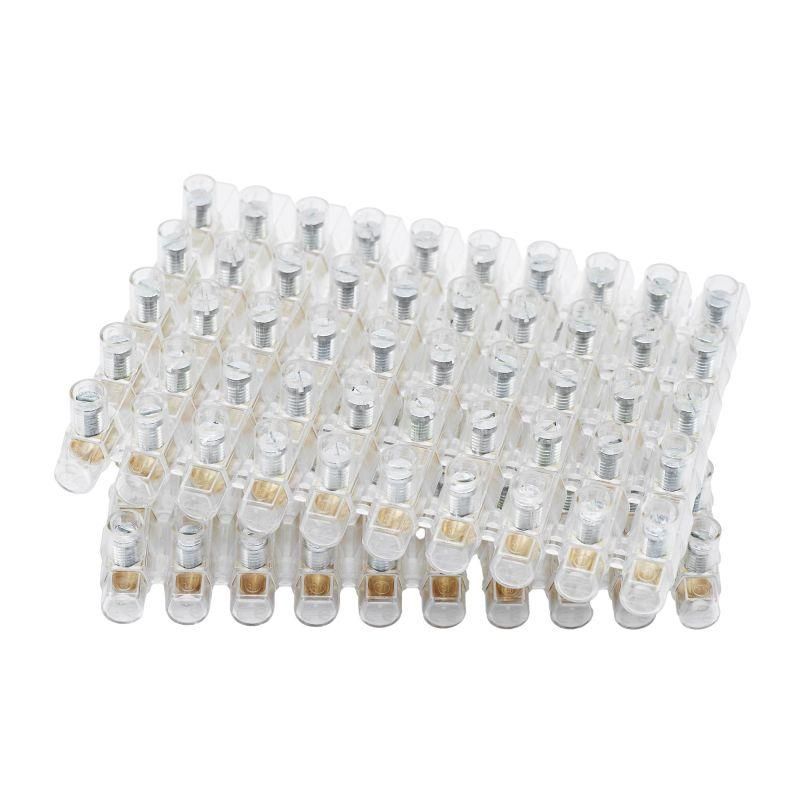 Зажим винтовой c одним отверстием предназначен для обеспечения надежного электрического соединения с помощью винтовой фиксации проводников между собой в цепях переменного или постоянного тока с напряжением до 400 В. Распространенное применение в распаячных коробках (для подключения электрических выключателей, розеток и т.д.) для подключения люстр и других световых приборов. Максимальное сечение проводника – 10 мм2. Прочные винты из оцинкованной стали, непозволящие сорвать резьбу. Материал изоляции – поликарбонат самозатухающий. Повышенная термоустойчивость: до +130 °С.