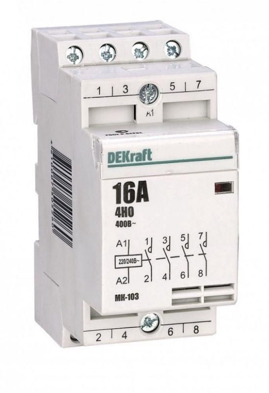 Модульный контактор серии МК-103 Dekraft; ном.ток 16 А (АС-7а); кол-во и исполнение контактов – 4НО; напряжение управления 220 В пер.тока; ширина – 2 мод. х 18 мм; установка – на DIN-рейку. Контакторы МК-103 применяются в сетях напряжением до 400 В пер.тока для дистанционного управления небольшими нагрузками, требующими большого количества включений / отключений, например, насосы, системы вентиляции и т.п. Модульные контакторы не требуют дополнительных настроек и специального обслуживания.
