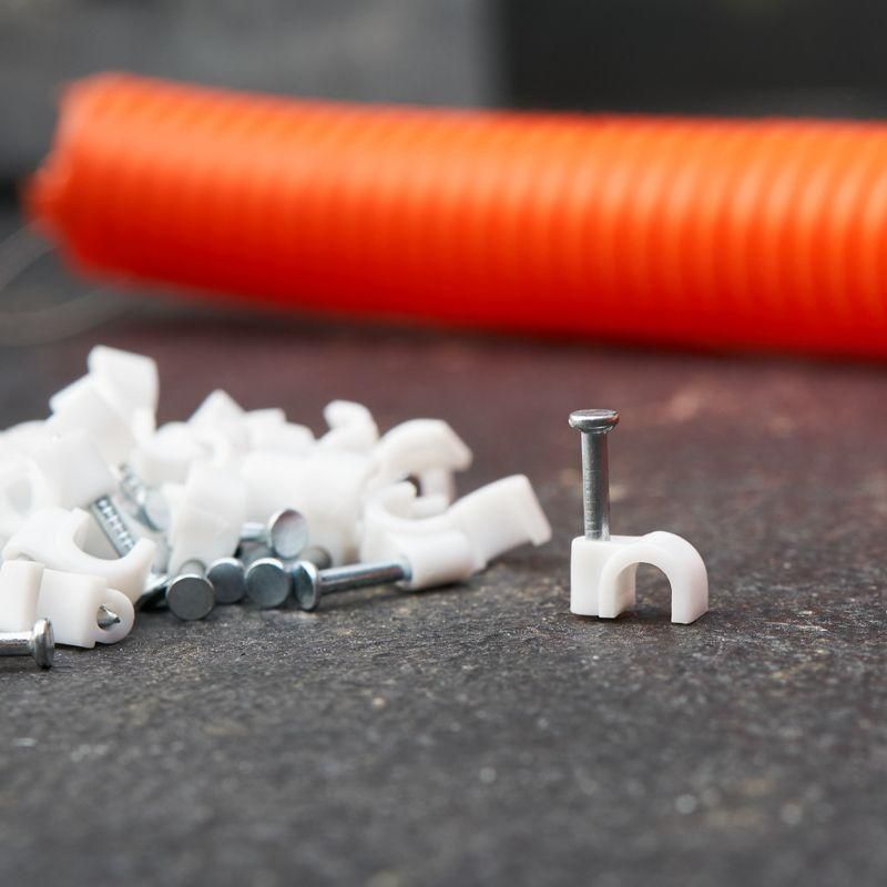 Круглый крепеж 4 мм с гвоздем предназначен для фиксации круглого кабеля к деревянной поверхности. Такой крепеж будет особенно полезен для использования на даче или в частном деревянном доме. Представляет собой дугообразную скобу белого цвета, выполненную из качественного пластика, с гвоздем в специальном отверстии. Скоба используется для мгновенного и надежного крепления проводов и кабелей к поверхностям стен, несущих конструкций и потолков. Гвоздь выполнен из закаленной стали, что позволяет закрепить его даже в плотной и твердой древесине без риска погнуть или сломать.